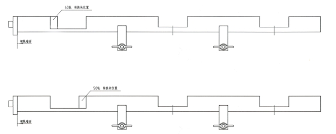 5.2 50kg/m和60kg/m鋼軌使用的是一個(gè)定位尺,如圖所示,將轉(zhuǎn)換塊安裝在軌端一側(cè)即為60kg/m鋼軌使用,將轉(zhuǎn)換塊安裝在另一側(cè)即為50kg鋼軌使用。
